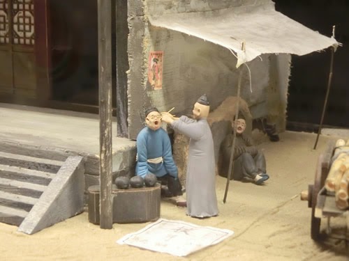 本區分兩邊,將清末民初時代得庶民生活微妙微俏呈現,較傳統是徐世英師傅所創作,較先進則是徐師傅兒子所創,在此除了看房裡或是街道上的人物塑麵,也可以留心看看鐘樓、鼓樓,有的是用木板有的是用紙板或是金屬,組合而成,哇~好像真的,當然也看得各行各業市井小民-蹓鳥的老先生/賣竹竿/打金子/挑糞得糞車,因為以前沒有抽水馬桶,一定要有人去挑糞,因此有這行業,當然也可以看到蔬果商,北京由於冬天較冷,蔬菜選擇種類較少,所食用大都以瓜果為主,在台灣喝得是奶茶,在北京喝得奶茶是指羊奶,當時大都是旗人入關,他們習慣喝奶茶,不像我們還喝綠茶(純喝茶),當時賣瓷器的商店,也有區隔,較高級的放在店裡賣,普通的則在路邊賣,在此還讓人看到忍不住發出慧心一笑得行業"拔牙"(露天遊醫),拔牙~拔牙~個人是曾經在台灣看過露天理髮店,露天拔牙還是第一次看到,當時的拔牙就是在露天,根本不管什蜂窩性組織炎/麻醉..等危險,尤其看這"拔牙"麵塑中的等候的病人,感覺他蠻痛苦的,可是他還是坐在地上等待拔牙,希望趕快輪到他,事後想想,當現代人真好,起碼拔牙可以上麻醉,感覺比較不可怕,不~不~不~對個人來說還是挺恐懼,....總之大家除了定期洗牙,也要每天仔細清潔牙齒.