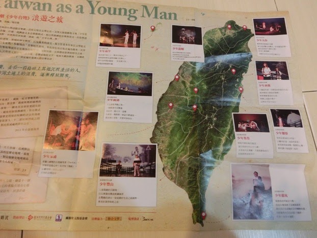 簡單舞台設計,左右兩邊都有提示劇情文字布簾,看著布簾上的文字,大家就跟著蔣勳老師腳步,來趟少年台灣之旅吧,看了這10個地名,熟悉的有九份/龍峒/鹽寮/集集/笨港/鹿港/南竿,沒聽過得有西寶/龍坑/豐山,邊聽音樂邊看劇情,還可以跟著布簾上的文字複習一下歷史與地理,還真有趣,在布簾中才得知原來"西寶"位在花蓮縣秀林鄉,盛產番茄,台灣最南端不是鵝鑾鼻而是屏東縣恆春鎮-龍坑.