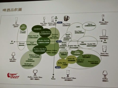 啤酒品飲圖,此圖在於輔助飲用啤酒的輔助工具,因為每個人喜歡的啤酒風味,不太一樣,喜愛甜的,盡量選靠近左手邊是酒種,若是男性想要喝苦一點的,往右手邊找