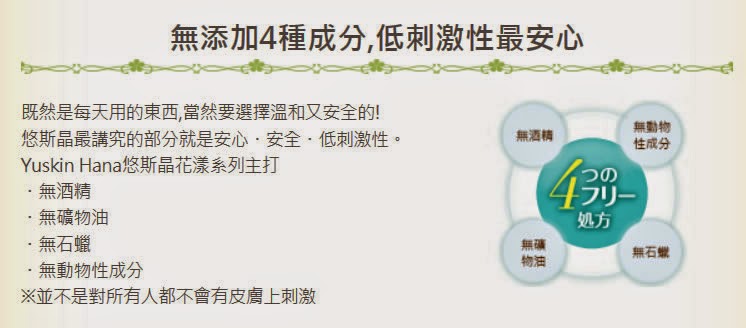 Yuskin Hana悠斯晶花漾系列主打無酒精/無礦物油/無石蠟/無動