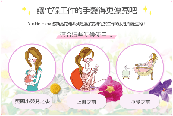 Yuskin Hana悠斯晶花漾系列也是配合保濕成分維他命E與維他命B6與甘油而製作出來的,是一年四季都可以呵護全家人的護手的保養聖品.