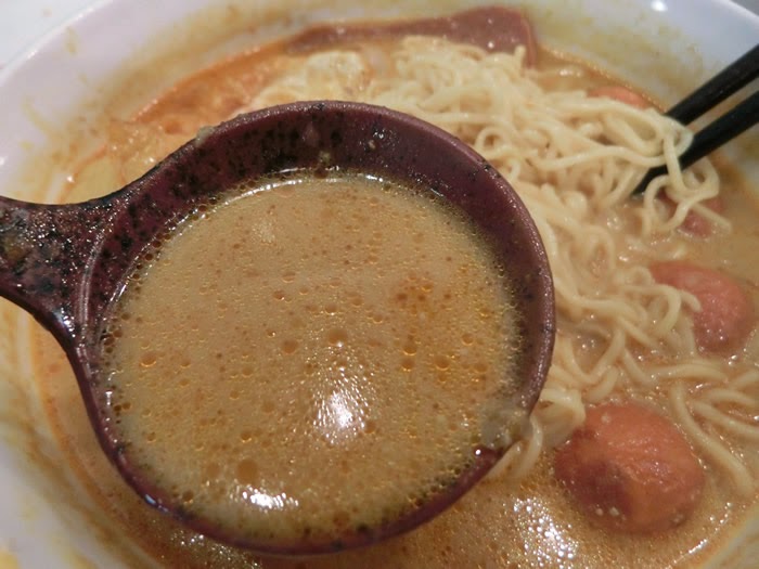 吃著一口麵,再喝下一瓢咖哩湯,