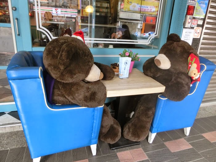 有1對黑熊在迎接客人,仔細一看,